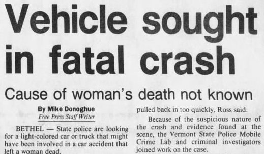 Continue reading “Missing: Patricia Hesse”On Tuesday, April 29, 1992, Cheryl Lunna’s overturned car was found on Camp Brook Road in Bethel, Vermont. The car appeared to have gone off the road at a curve and landed in a stream. An investigation revealed she was likely run off the road by another driver. A suspect was eventually arrested, but no one was ever convicted for any crime related to her death.